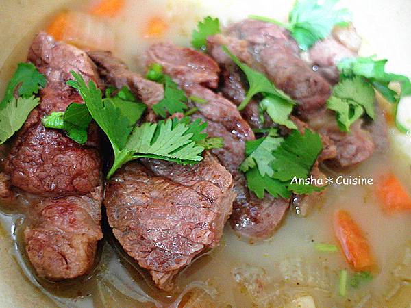 4.食材熟透即可裝盤,再把牛排切好放上去,灑上香菜就完成囉!