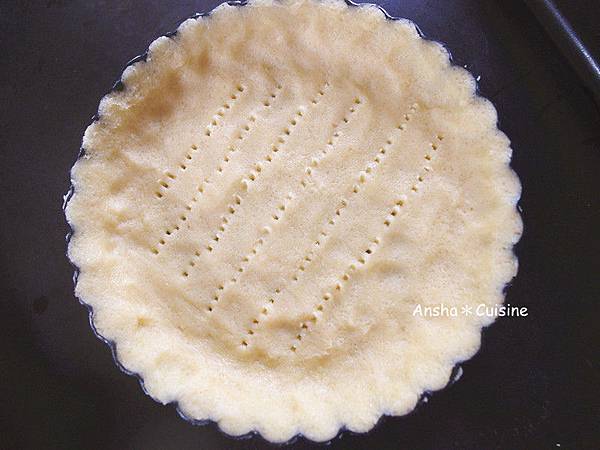 2.(份量是6吋的南瓜派2個)麵團分成2團,桿平放進烤盤,用叉子戳洞,避免塔皮烘烤時變形