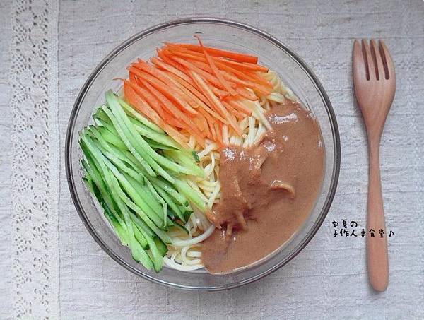 3.把所有沾醬食材通通攪拌均勻,淋上去,就跟外面的涼麵一模一樣喔!愛吃辣的人也可加上一匙辣油~
