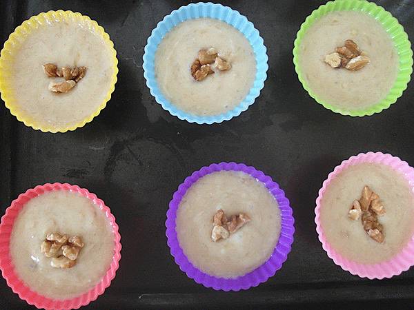 3.最後再加入麵粉、蘇打粉拌勻倒入容器中,灑上核桃