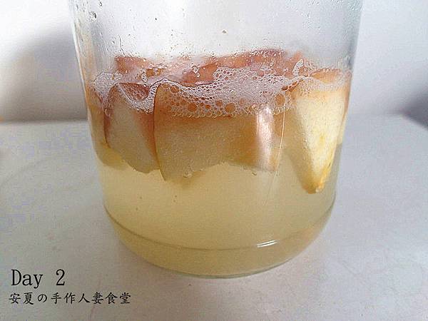 第2天:那些氣泡就是酵母喔!水變淡黃色聞起來有淡淡的蘋果酒精味(現在夏天發酵比較快)