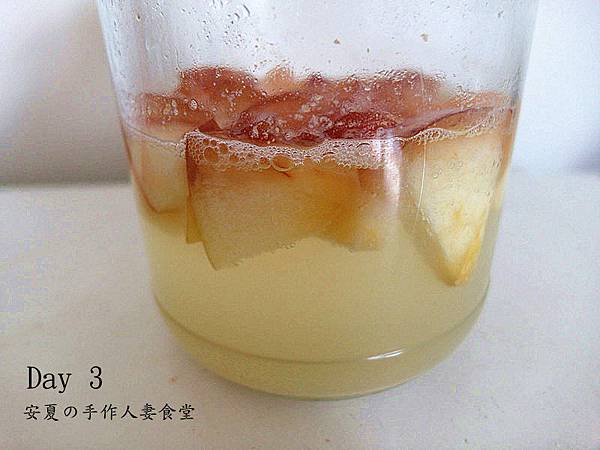 第3天:酵母變少了,底部有沉澱物(相機拍不出來)有濃濃的蘋果酒醋味,酸味很溫淳,不能像東西壞掉一樣的刺鼻酸味,發臭和發酵只在一線之間喔!