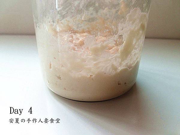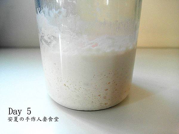 第5天:丟棄50g的酵母,再加入50g的麵粉+50g的水+一小匙醣+一小撮鹽(捨棄ㄧ些酵母會發酵的比較好)
