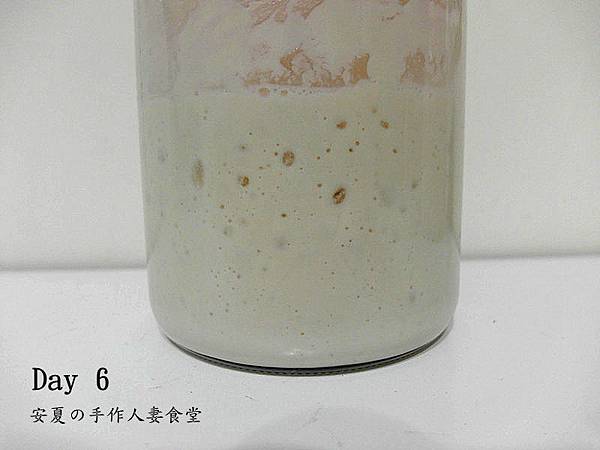 第6天:再丟棄50g的酵母,加入50g的麵粉+50g的水+一小匙醣+一小撮鹽