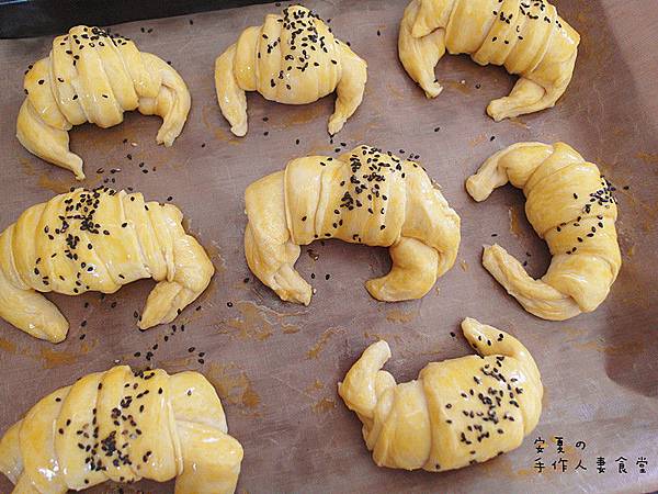 5.每片三角形再桿平後捲起來,鬆弛15分鐘後塗上蛋液,灑上芝麻