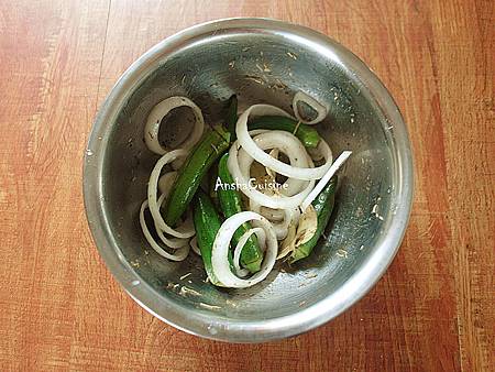 4.這次是用氣炸鍋,180度(也可用烤箱)預熱完後放入雞腿先烘烤10分鐘,這段時間把配菜放進剛剛雞腿的香料裡醃漬