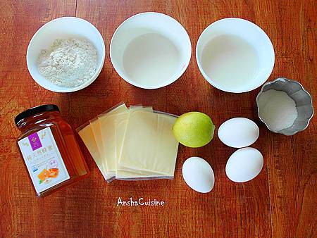 1.麵粉過篩+牛奶A+蛋黃+蜂蜜+檸檬汁混合