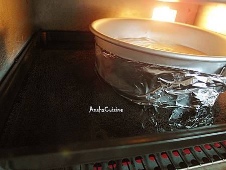 6.水浴法-烤箱用深盤加滿水180度預熱完成,再放入烘烤10分鐘至表面上色,調溫度120度再烤40分鐘(我是用活動模,所以包一層鋁箔紙預防水滲進去)