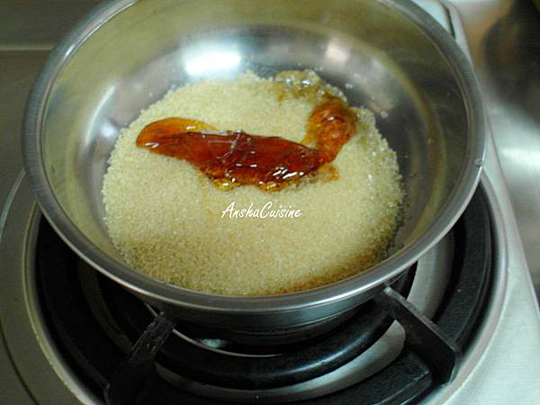 1.糖加入麥芽糖放入鍋中,稍微加熱融化成焦糖