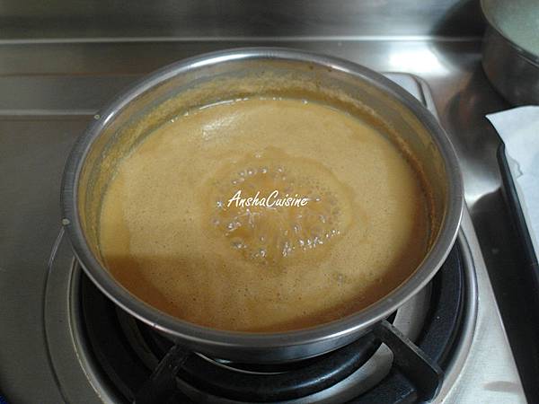 2.加入鮮奶油攪拌加熱至120度(約中小火20分鐘,一定要把水分充分揮發,才會凝固喔!)要不斷攪拌避免燒焦