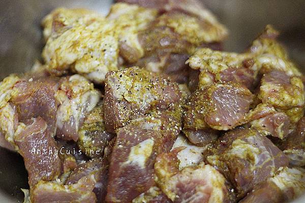 把梅花豬肉切成約2公分的塊狀,加入一大匙咖哩粉和黑胡椒醃漬一個晚上