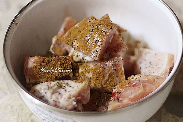 2。雞腿肉切塊加入肉桂粉,黑胡椒,壓碎的八角放冰箱醃漬一晚