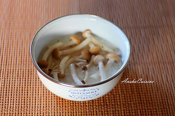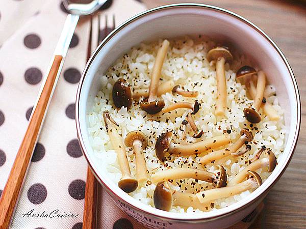 1。把菇類放進米中,放入電鍋,外鍋加一杯水蒸熟