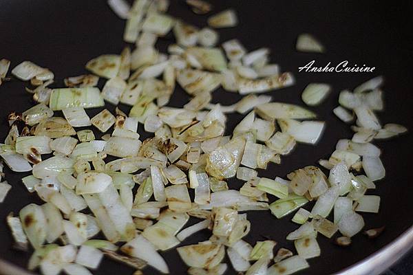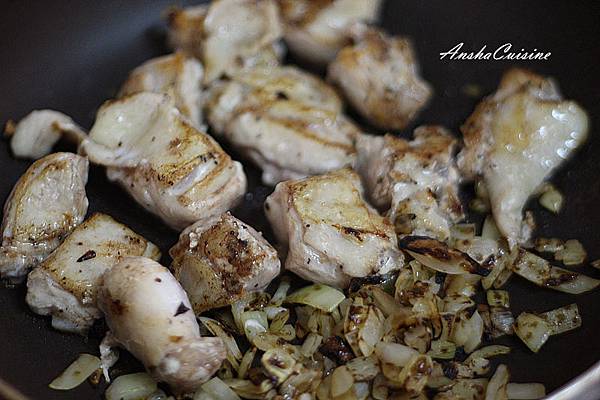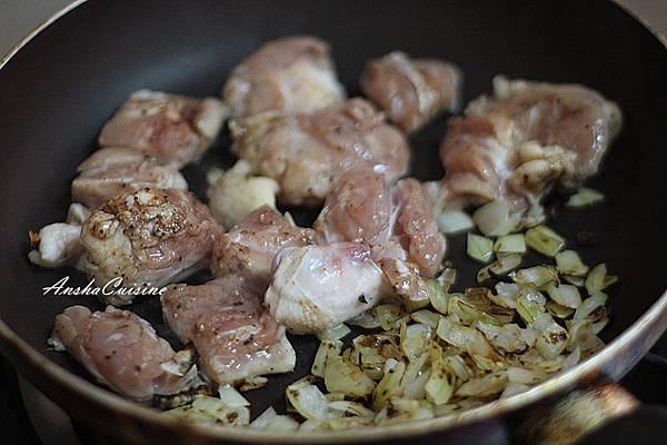 3。把雞肉2面煎的焦香(洋蔥持續辦炒中)