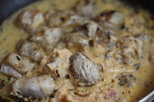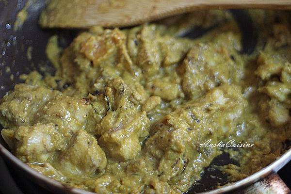 4。加入腰果蕃茄泥,咖哩粉,鹽巴,黑胡椒和半杯熱水拌勻悶煮