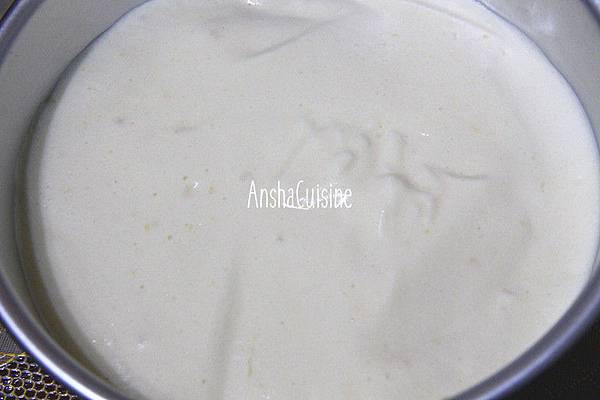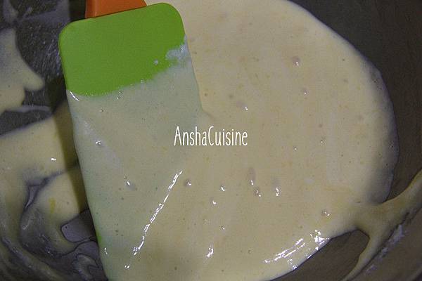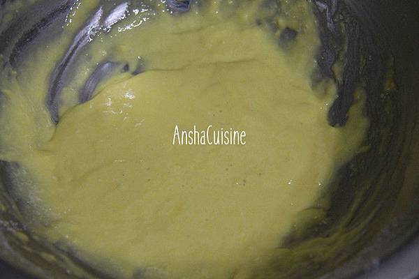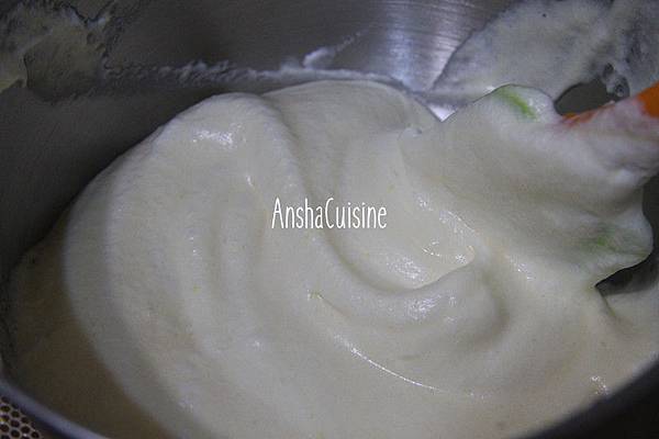 再將麵糊倒回至蛋白快速混合(小心不要消泡)