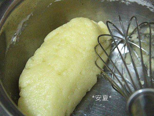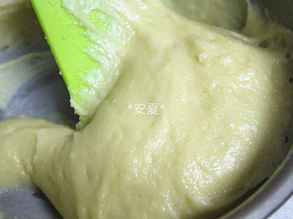 雞蛋液分3次加入麵糊裡混合後,將麵糊放入擠花袋