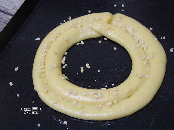 擠上2圈的麵糊,灑上杏仁粒(多餘的麵糊擠在空位處當夾心)