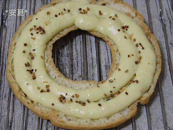 將稍涼的巴黎圈剖半,擠入卡士達醬,灑上杏仁粒