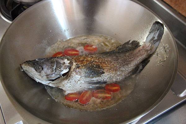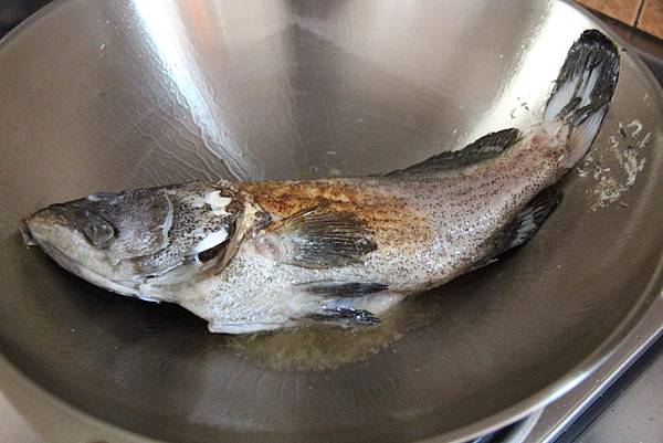 熱油鍋將魚抹上鹽巴和黑胡椒,下油鍋煎至2面金黃