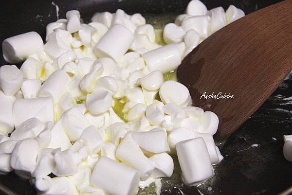 準備不沾鍋,加入奶油溶化後,加入剪小塊的棉花