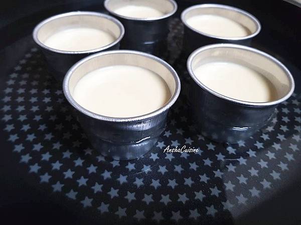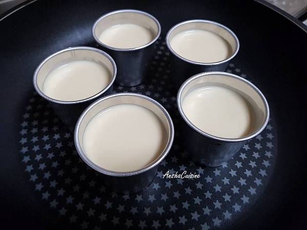 布丁液倒入容器中,放進平底鍋中