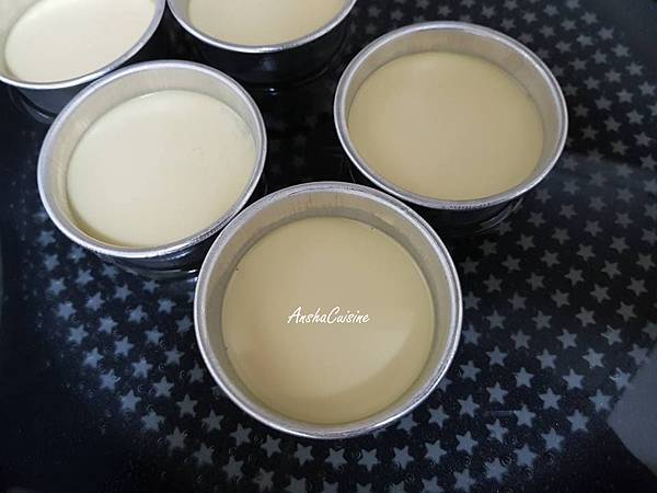 倒入冷水,高度至布丁杯的一半