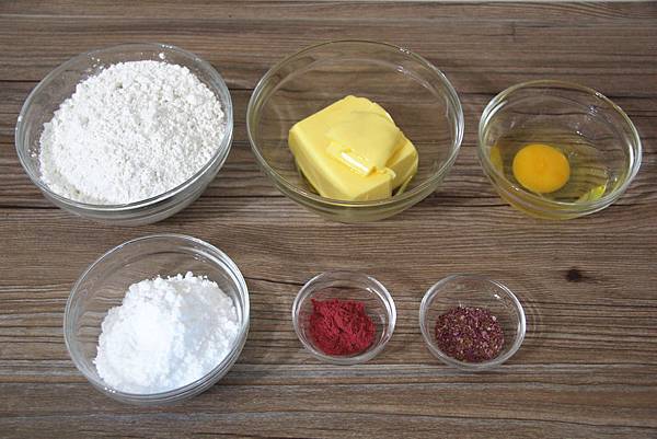 先把食材準備好,玫瑰花瓣要先磨成粉
