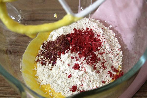 再倒入鍋篩的麵粉,玫瑰花粉和覆盆莓粉攪拌