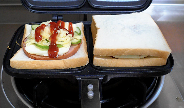 7.蓋下早午餐鍋,兩面各烤2分鐘左右,土司變金黃後即可起鍋